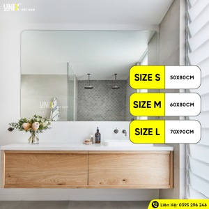 Hãy chọn một chiếc gương bo viền nếu bạn muốn phòng tắm trở nên hài hòa và hiện đại hơn đồng thời vẫn muốn mở rộng không gian. Viền bo ở bốn góc sẽ giảm bớt cảm giác góc cạnh và tăng sự thoải mái, trẻ trung cho sản phẩm. Bên cạnh đó, viền gương được mài cắt kim cương siêu bóng, không gây nguy hiểm cho người sử dụng. Cũng nhờ vẻ ngoài đơn giản mà không đơn điệu của mình, gương nhà tắm chữ nhật bo góc phù hợp với nhiều không gian phòng tắm. Unix House có 3 kích thước gương phổ biến để bạn lựa chọn gồm: Size S (50x80cm) | Size M (60x80cm) | Size L (70x90cm).